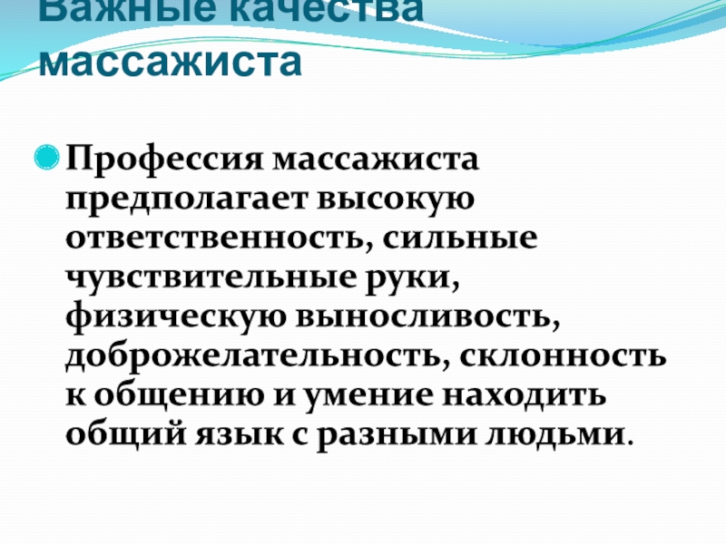 Важные качества массажиста Профессия массажиста предполагает высокую ответственность, сильные чувствительные руки, физическую выносливость, доброжелательность, склонность к общению