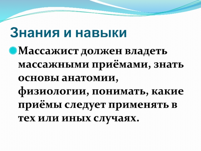 Массажист должен владеть массажными приёмами, знать основы анатомии, физиологии,
