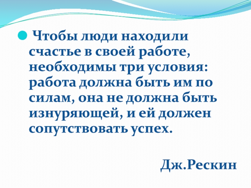 Слайд 2 Чтобы люди находили счастье в своей работе, необходимы три условия: