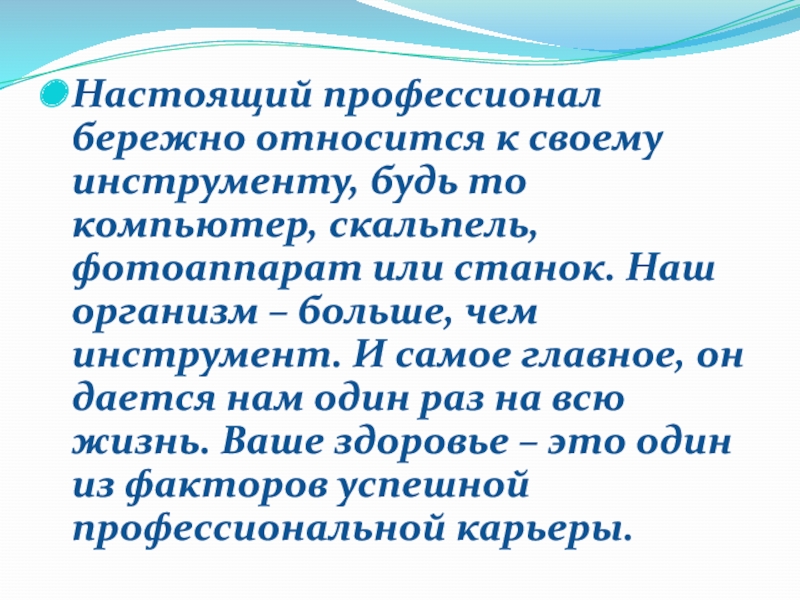 фотоаппарат или станок. Наш организм – больше, чем инструмент. И самое главное, он дается нам один раз на всю жизнь. Ваше здоровье – это один из факторов успешной профессиональной карьеры.