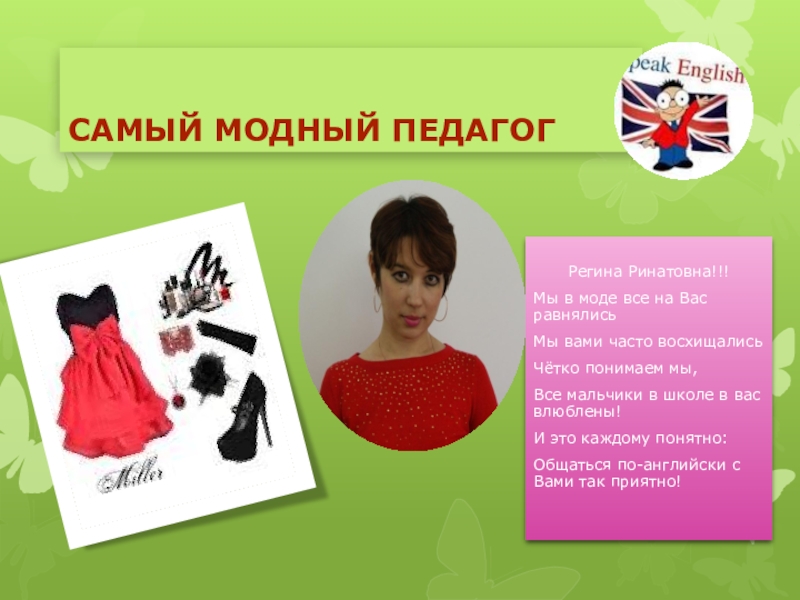 Самый модный педагогРегина Ринатовна!!!Мы в моде все на Вас равнялисьМы вами часто восхищалисьЧётко понимаем мы,Все мальчики в