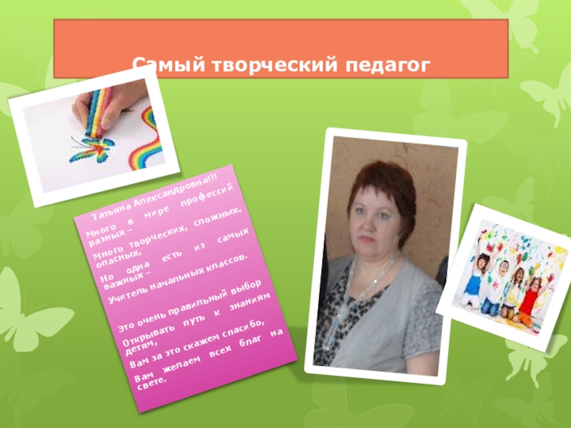 Самый творческий педагогТатьяна Александровна!!!Много в мире профессий разных –Много творческих, сложных, опасных,Но одна есть из самых важных