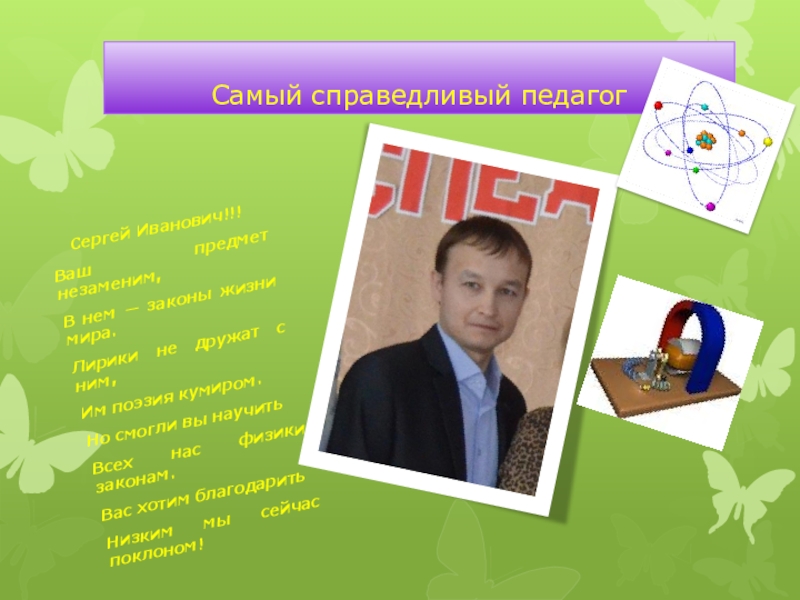 Самый справедливый педагогСергей Иванович!!!Ваш предмет незаменим,В нем — законы жизни мира.Лирики не дружат с ним,Им поэзия кумиром.Но
