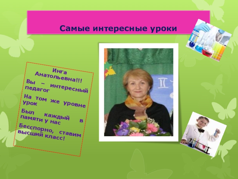 Самые интересные урокиИнга Анатольевна!!! Вы – интересный педагогНа том же уровне урокБыл каждый в памяти у нас
