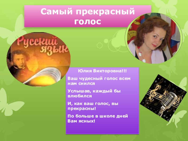 Самый прекрасный голосЮлия Викторовна!!!Ваш чудесный голос всем нам снилсяУслышав, каждый бы влюбилсяИ, как ваш голос, вы прекрасны!По больше в школе дней Вам ясных!