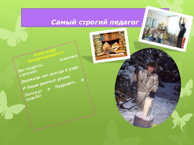 Самый строгий педагогАлександр Владимирович!!!Вы-педагог, конечно строгий!Держали нас всегда в уздеИ Ваши дивные урокиПомогут в будущем, в судьбе!