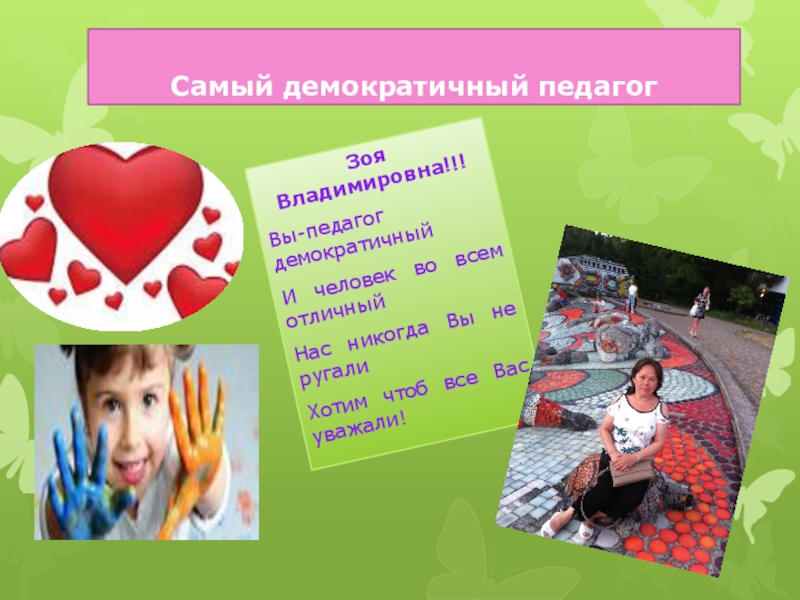 Самый демократичный педагогЗоя Владимировна!!!Вы-педагог демократичныйИ человек во всем отличныйНас никогда Вы не ругалиХотим чтоб все Вас уважали!