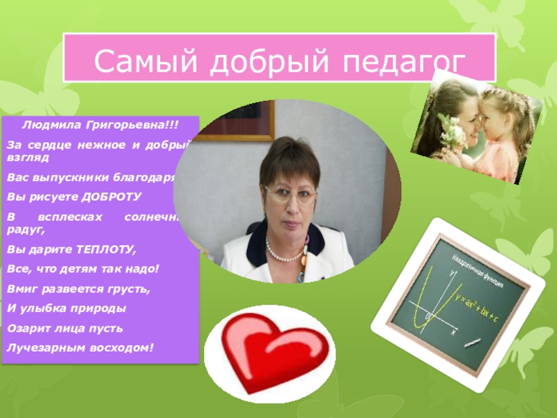 Самый добрый педагогЛюдмила Григорьевна!!! За сердце нежное и добрый взглядВас выпускники благодарятВы рисуете ДОБРОТУВ всплесках солнечных радуг,Вы
