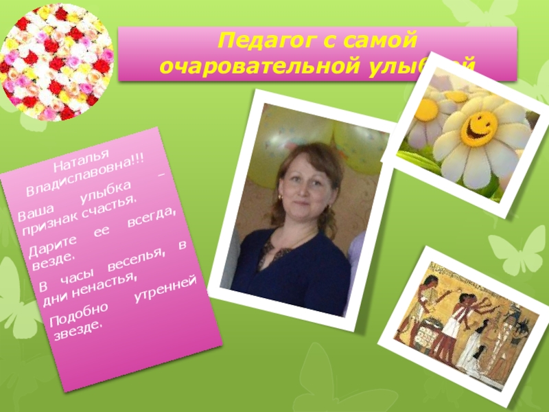 Педагог с самой очаровательной улыбкойНаталья Владиславовна!!! Ваша улыбка – признак счастья.Дарите ее всегда, везде.В часы веселья, в