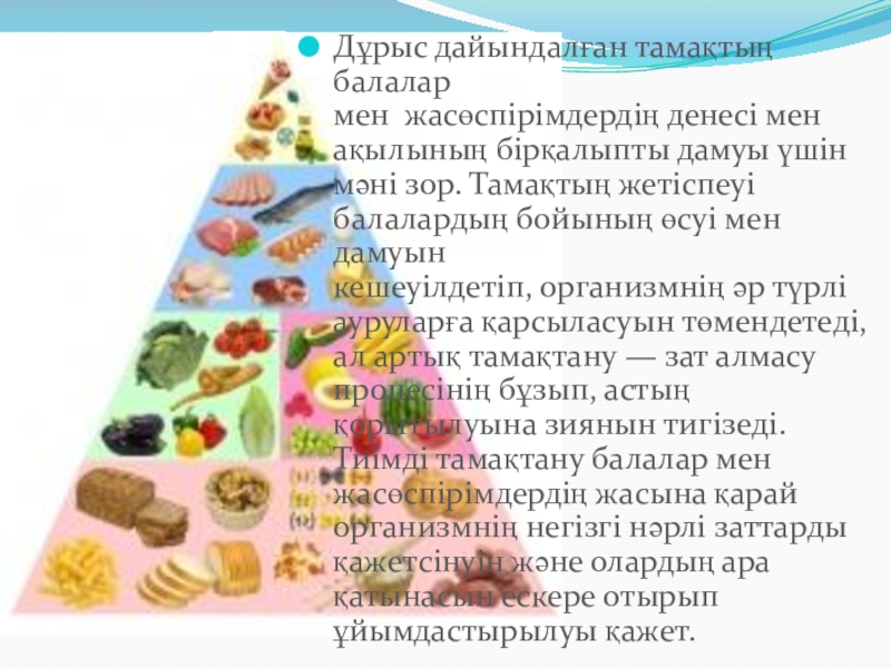 Слайд 2Дұрыс дайындалған тамақтың балалар мен  жасөспірімдердің денесі мен ақылының бірқалыпты дамуы үшін