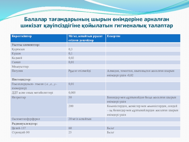 Слайд 8 Балалар тағамдарының шырын өнімдеріне арналған шикізат қауіпсіздігіне қойылатын гигиеналық талаптар