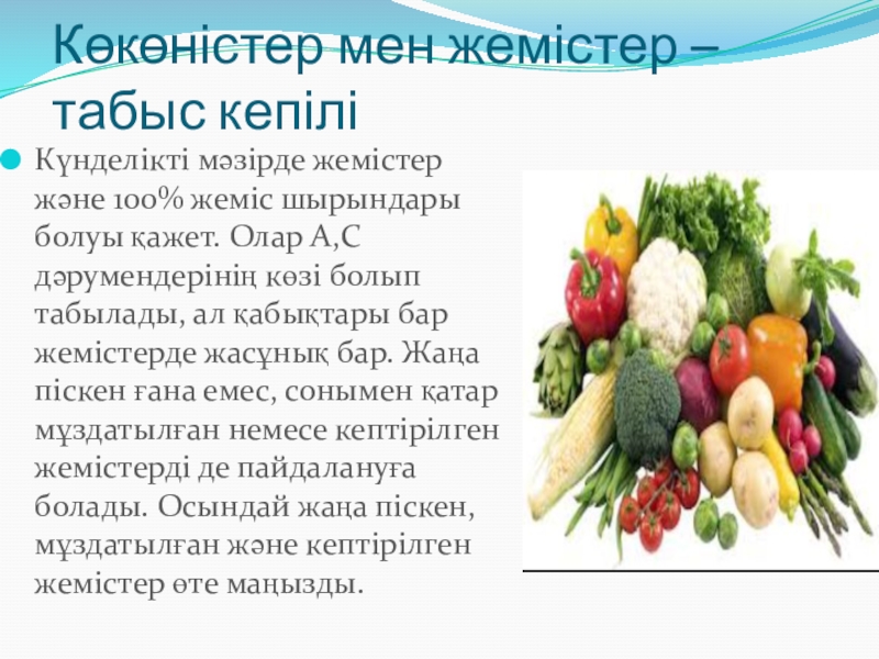 Көкөністер мен жемістер – табыс кепіліКүнделікті мәзірде жемістер және 100% жеміс шырындары болуы