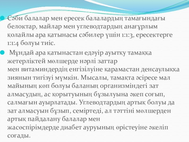 Слайд 3Сәби балалар мен ересек балалардың тамағындағы белоктар, майлар мен углеводтардың анағұрлым