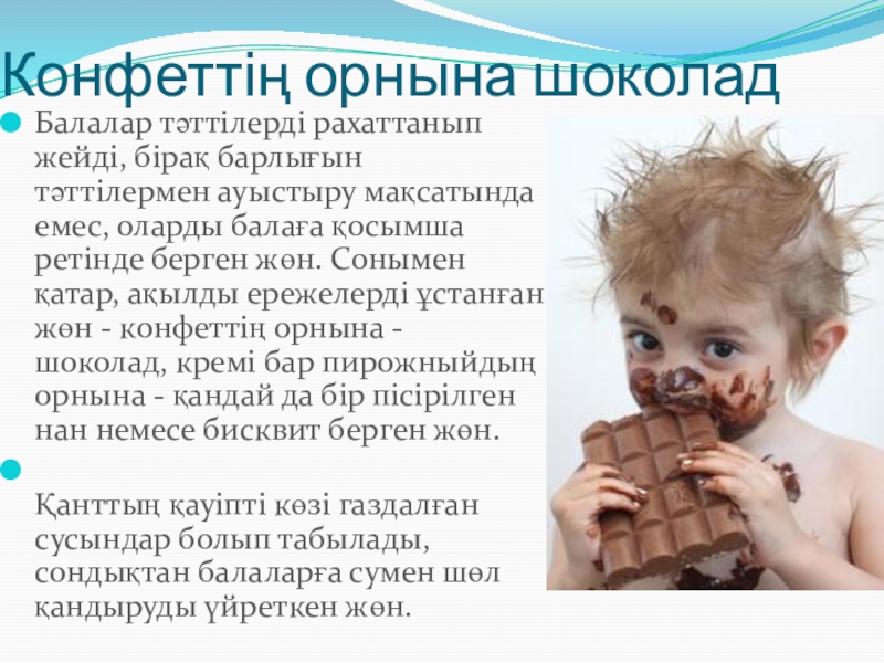 Конфеттің орнына шоколадБалалар тәттілерді рахаттанып жейді, бірақ барлығын тәттілермен ауыстыру мақсатында емес, оларды балаға қосымша ретінде берген