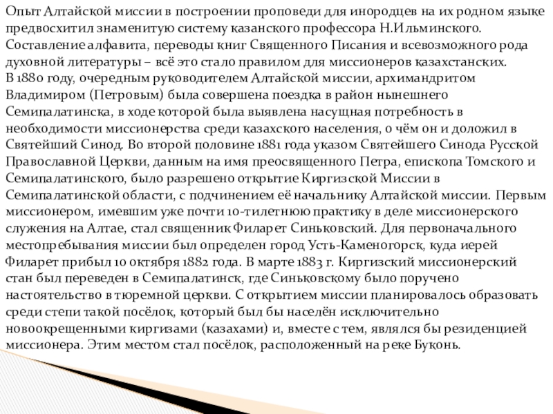 языке предвосхитил знаменитую систему казанского профессора Н.Ильминского. Составление алфавита, переводы книг Священного Писания и всевозможного рода духовной литературы – всё это стало правилом для миссионеров казахстанских.