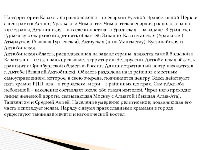 в Астане, Уральске и Чимкенте. Чимкентская епархия расположена на юге страны, Астанинская – на северо-востоке, а Уральская – на западе. В Уральско-Гурьевскую епархию входят пять областей: Западно-Казахстанская (Уральская), Атырауская (бывшая Гурьевская), Актауская (п-ов Мангыстау), Кустанайская и Актюбинская.