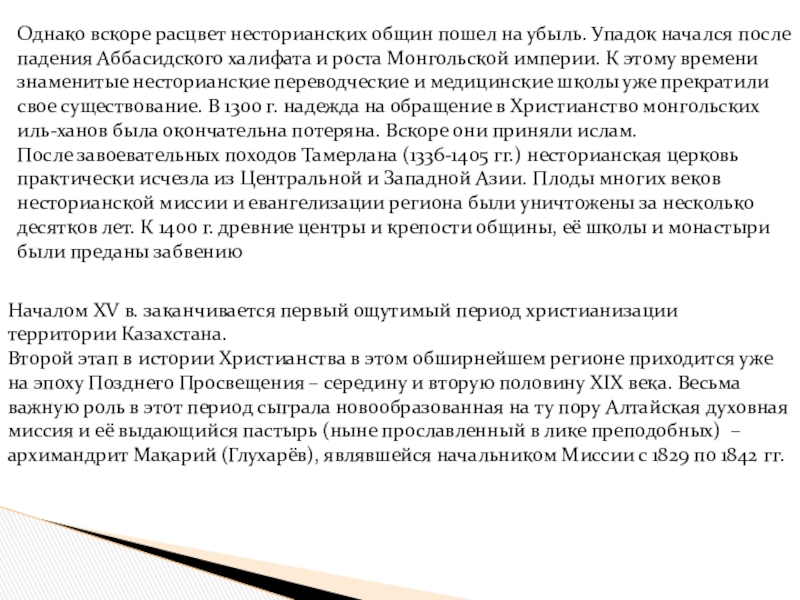 Началом XV в. заканчивается первый ощутимый период христианизации территории Казахстана.