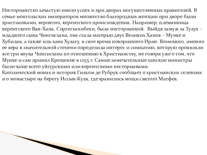 Слайд 26Несторианство зачастую имело успех и при дворах могущественных правителей. В семье