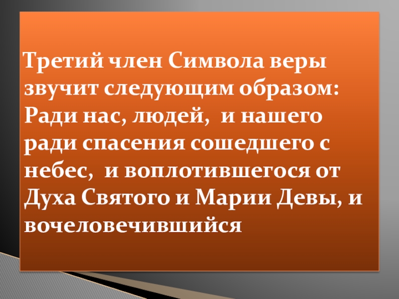 Слайд 10Третий член Символа веры звучит следующим образом: Ради нас, людей, и