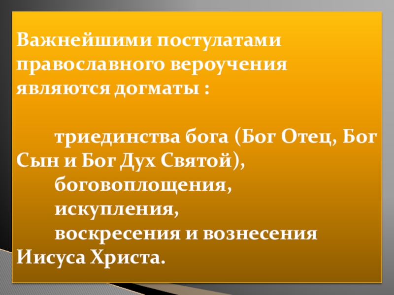 Слайд 6Важнейшими постулатами православного вероучения являются догматы :