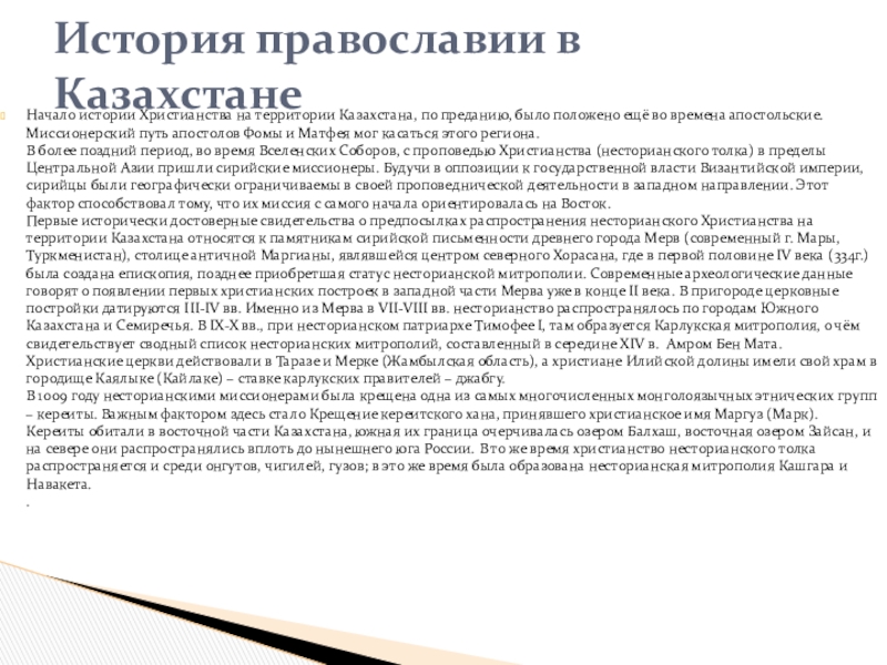 Слайд 24Начало истории Христианства на территории Казахстана, по преданию, было положено ещё