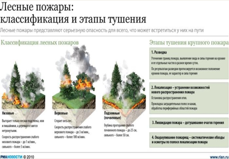 По скорости распространения огня низовые и верховые пожары делятся на устойчивые и беглые.