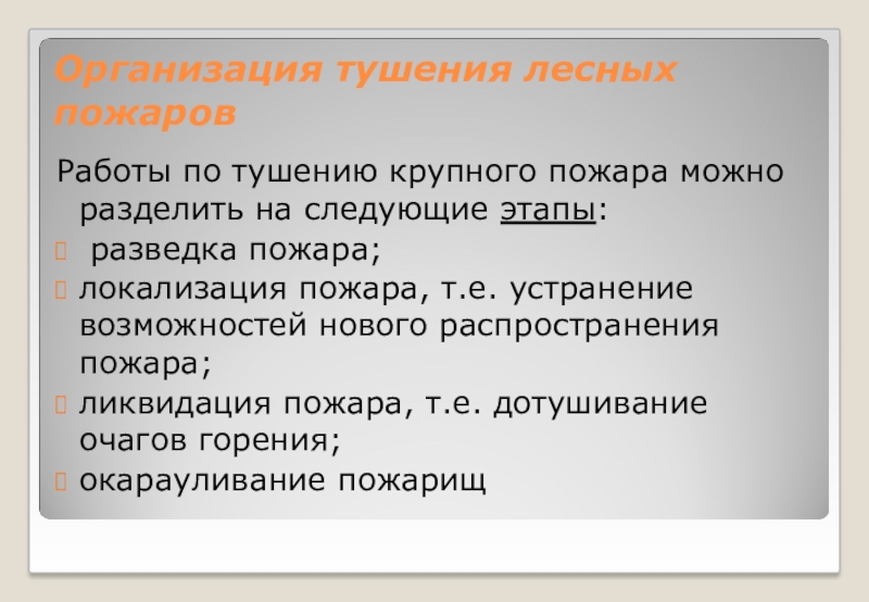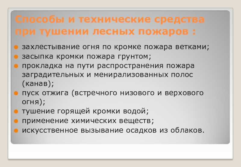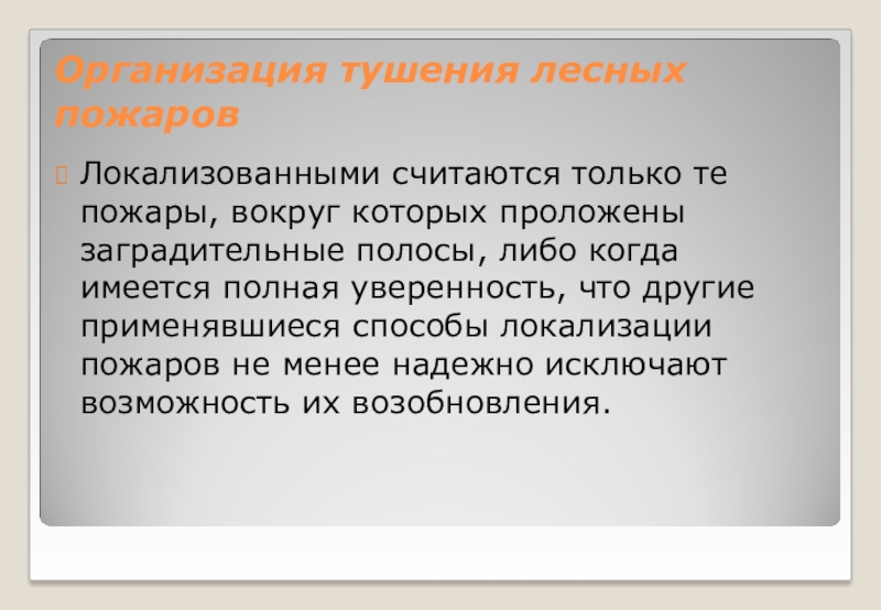 проложены заградительные полосы, либо когда имеется полная уверенность, что другие применявшиеся способы локализации пожаров не менее надежно исключают возможность их возобновления.