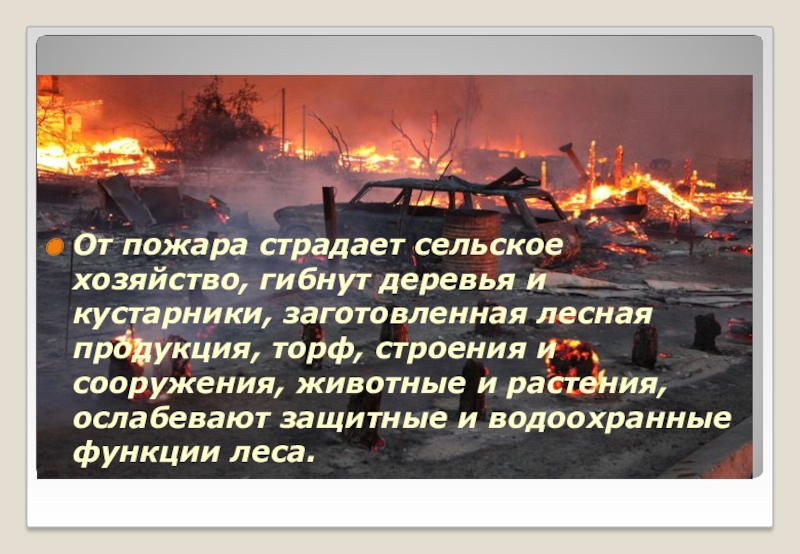 От пожара страдает сельское хозяйство, гибнут деревья и кустарники, заготовленная лесная