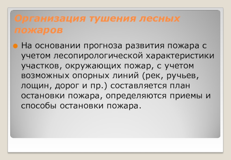 лесопирологической характеристики участков, окружающих пожар, с учетом возможных опорных линий (рек, ручьев, лощин, дорог и пр.) составляется план остановки пожара, определяются приемы и способы остановки пожара.