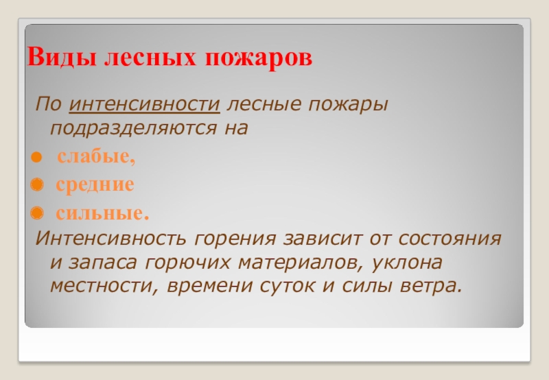Интенсивность горения зависит от состояния и запаса горючих материалов, уклона местности, времени суток и силы ветра.