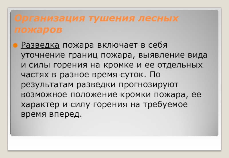 пожара, выявление вида и силы горения на кромке и ее отдельных частях в разное время суток. По результатам разведки прогнозируют возможное положение кромки пожара, ее характер и силу горения на требуемое время вперед.