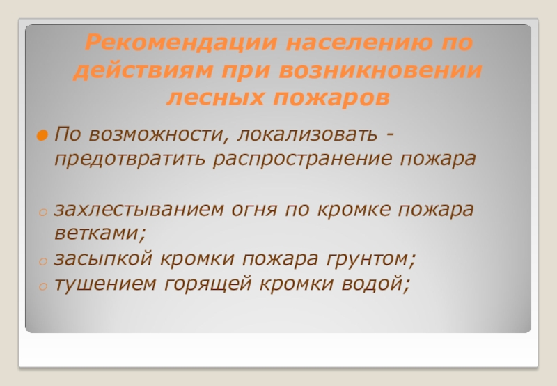 Слайд 18Рекомендации населению по действиям при возникновении лесных пожаров