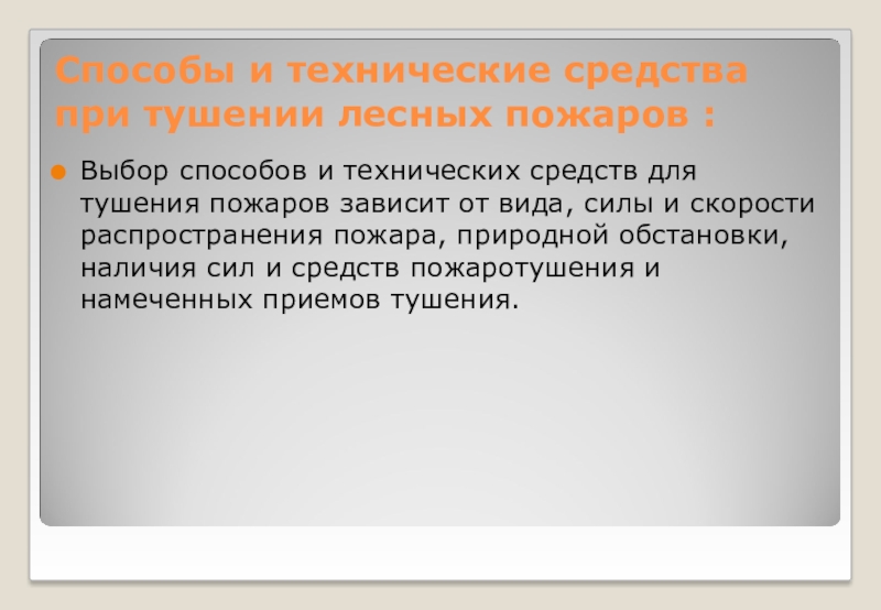 технических средств для тушения пожаров зависит от вида, силы и скорости распространения пожара, природной обстановки, наличия сил и средств пожаротушения и намеченных приемов тушения.