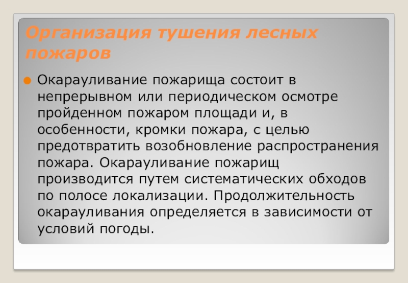 осмотре пройденном пожаром площади и, в особенности, кромки пожара, с целью предотвратить возобновление распространения пожара. Окарауливание пожарищ производится путем систематических обходов по полосе локализации. Продолжительность окарауливания определяется в зависимости от условий погоды.
