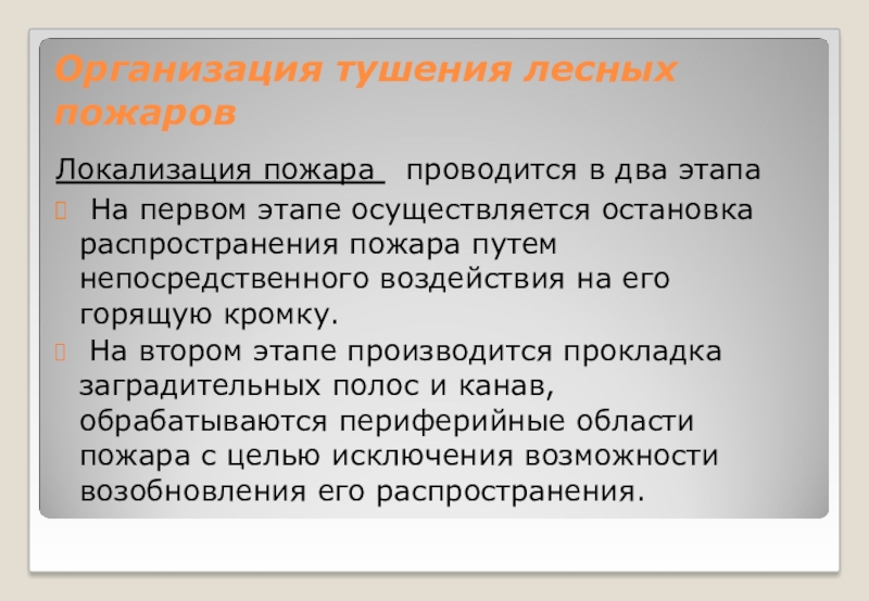 На втором этапе производится прокладка заградительных полос и канав, обрабатываются периферийные области пожара с целью исключения возможности возобновления его распространения.