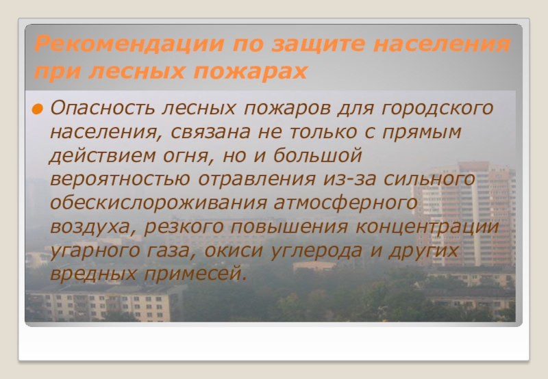 городского населения, связана не только с прямым действием огня, но и большой вероятностью отравления из-за сильного обескислороживания атмосферного воздуха, резкого повышения концентрации угарного газа, окиси углерода и других вредных примесей.