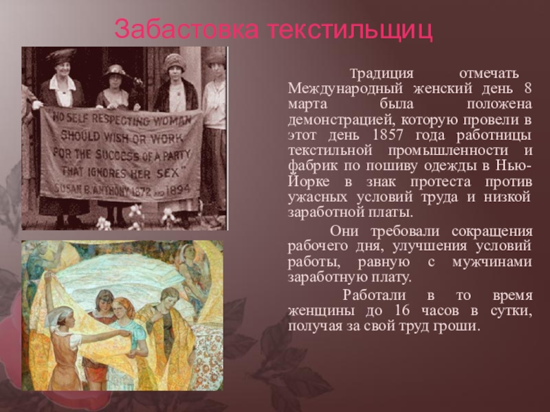 организации состоялся митинг с лозунгами о равноправии женщин. В этот день более 15000 женщин прошлись маршем через весь город, требуя сокращения рабочего дня и равных условий оплаты с мужчинами. Кроме того, выдвигалось требование предоставления женщинам избирательного права.
