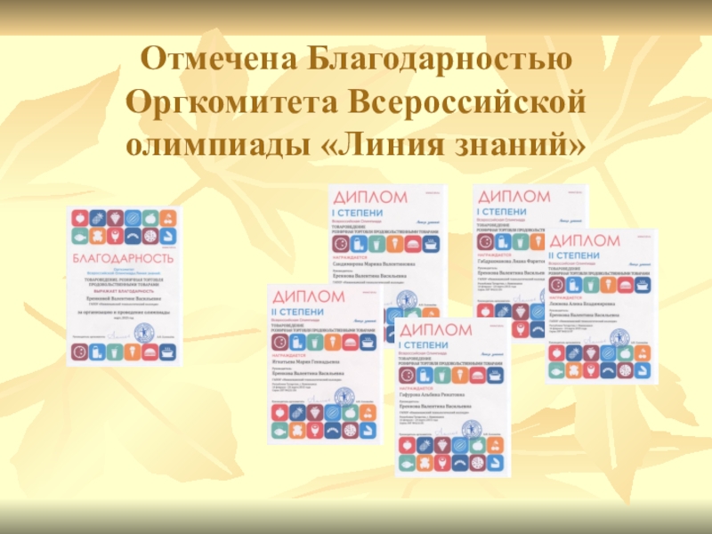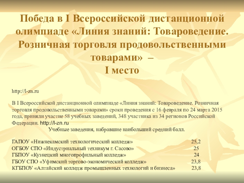 В I Всероссийской дистанционной олимпиаде «Линия знаний: Товароведение. Розничная торговля продовольственными товарами» сроки проведения с 16 февраля по 24 марта 2015 года, приняли участие 58 учебных заведений, 348 участника из 34 регионов Российской Федерации. http://l-zn.ru