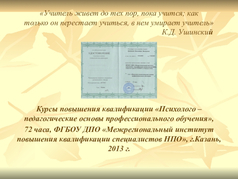 72 часа, ФГБОУ ДПО «Межрегиональный институт повышения квалификации специалистов НПО», г.Казань, 2013 г.