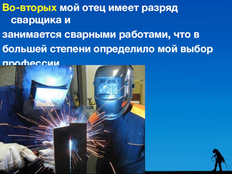 Слайд 5Во-вторых мой отец имеет разряд сварщика и