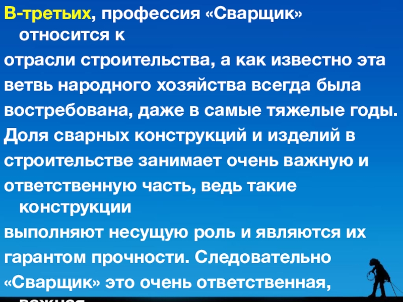 В-третьих, профессия «Сварщик» относится к отрасли строительства, а как известно эта ветвь народного хозяйства всегда была востребована,