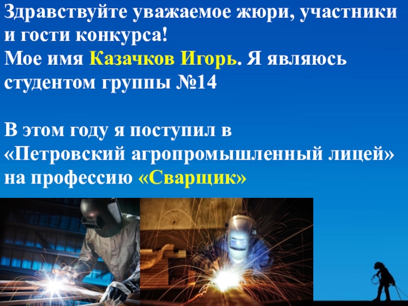 Здравствуйте уважаемое жюри, участники и гости конкурса! Мое имя Казачков Игорь. Я являюсь студентом группы №14В этом году я поступил в «Петровский агропромышленный лицей» на профессию «Сварщик»