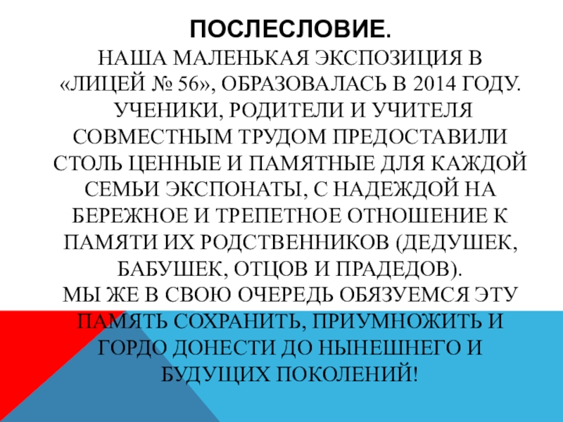 Слайд 15Послесловие. Наша маленькая экспозиция в «лицей № 56», образовалась в 2014 году.