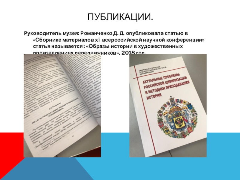 Публикации.Руководитель музея: Романченко Д. Д. опубликовала статью в «Сборнике материалов xi всероссийской научной конференции» статья называется :