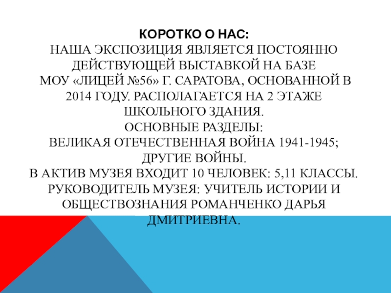 Коротко о нас: наша экспозиция является постоянно действующей выставкой на базе моу «лицей №56» г. Саратова, основанной в 2014 году. располагается на 2 этаже школьного здания. Основные разделы: Великая Отечественная война 1941-1945; Другие войны. В