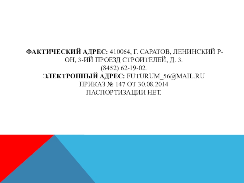 Слайд 16Фактический адрес: 410064, г. Саратов, Ленинский р-он, 3-ий проезд Строителей, д.