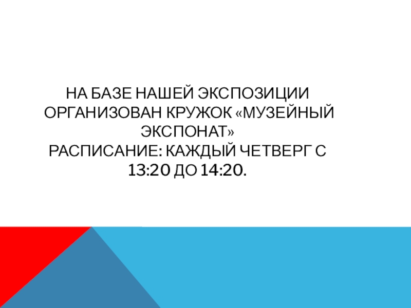 Слайд 3На базе нашей экспозиции организован кружок «Музейный экспонат» Расписание: каждый четверг с