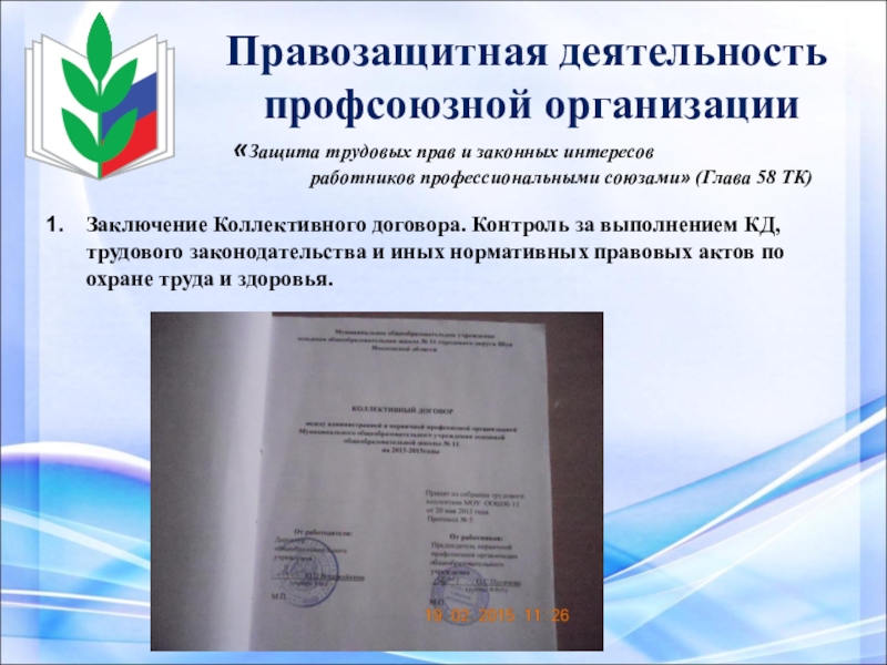 Заключение Коллективного договора. Контроль за выполнением КД, трудового законодательства и иных нормативных правовых актов по охране труда и здоровья.