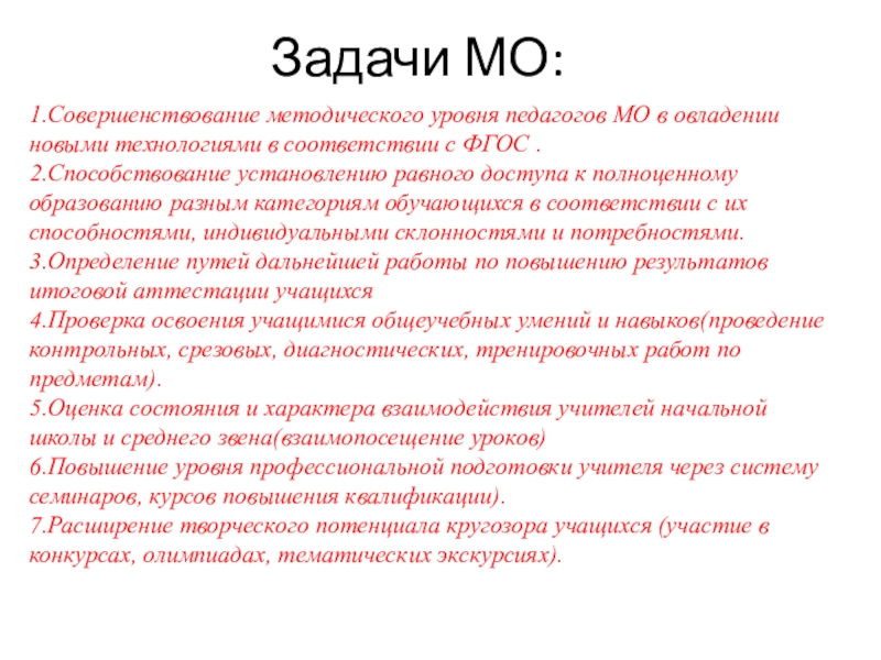 1.Совершенствование методического уровня педагогов МО в овладении новыми технологиями в соответствии с ФГОС .