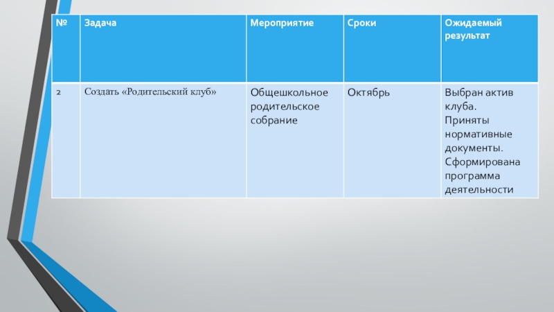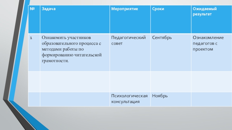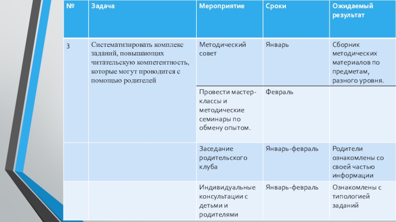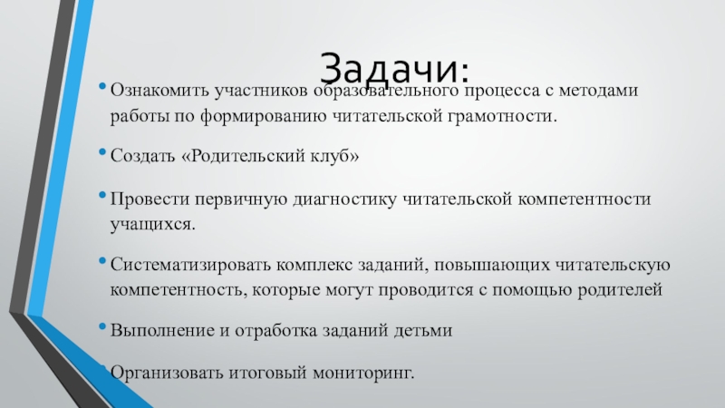 Задачи: Ознакомить участников образовательного процесса с методами работы по формированию читательской грамотности.Создать «Родительский клуб»Провести первичную диагностику читательской